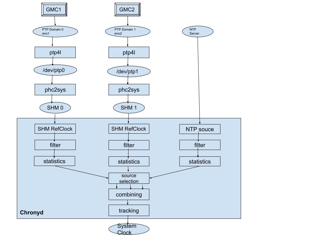 Here, Chronyd will use time references provided by eno1, eno2 and NTP server. If eno1 becomes unstable/falseticker, chronyd moves to eno2, if eno2 too becomes unavailable, it moves to NTP server. If eno1,eno2 recover, chrony uses them again and reset system time.